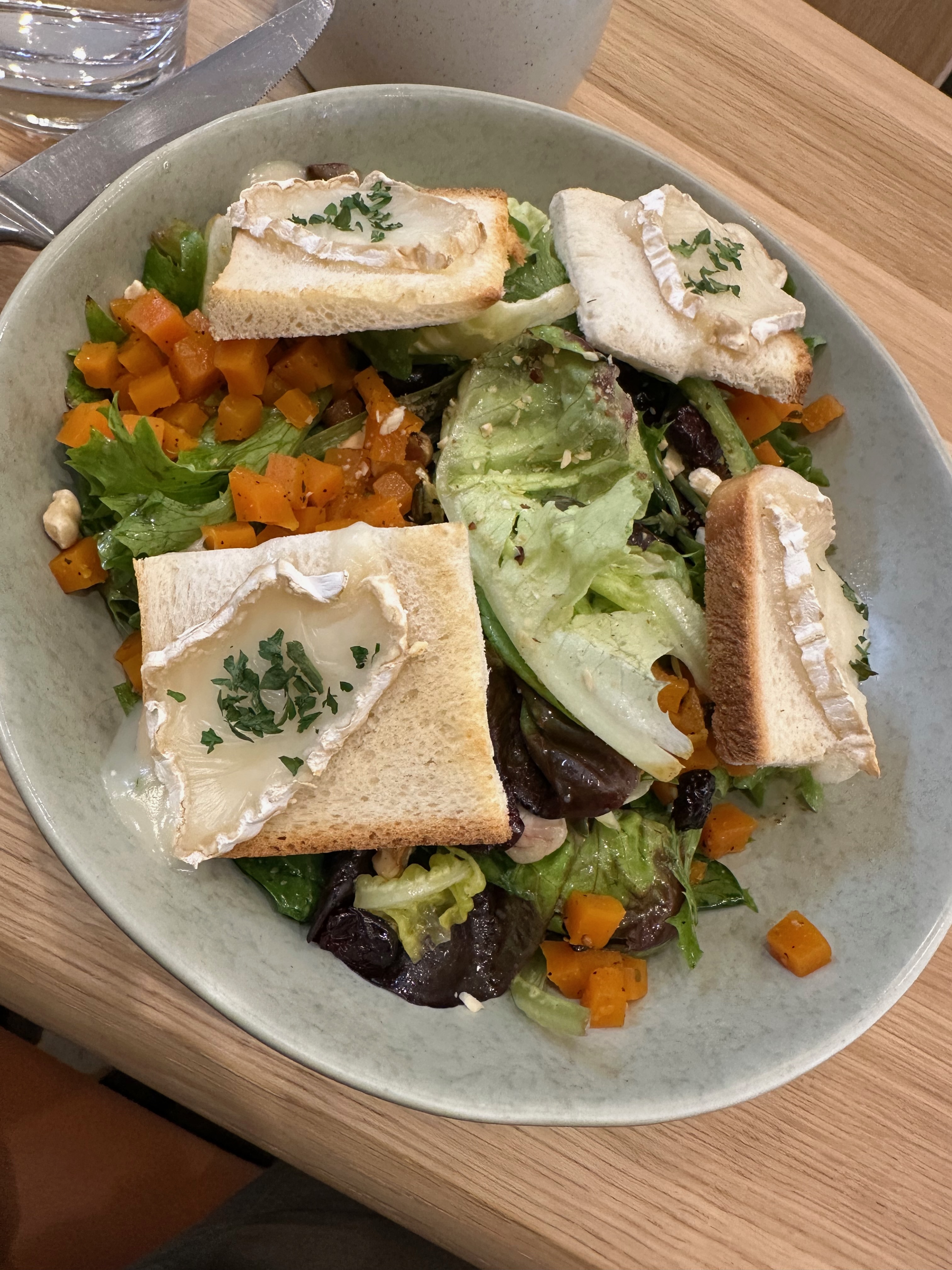 The Salade Chèvre Chaud arrives generous and composed. A bed of mixed greens is layered with honey-roasted courges (squash), toasted hazelnuts, pumpkin seeds, cranberries, and topped with warm goat cheese toasts — the chèvre melted just enough to soften and spread, with its edges golden from the heat. A mustard vinaigrette ties everything together with a gentle sharpness that lifts the sweetness of the roasted squash.