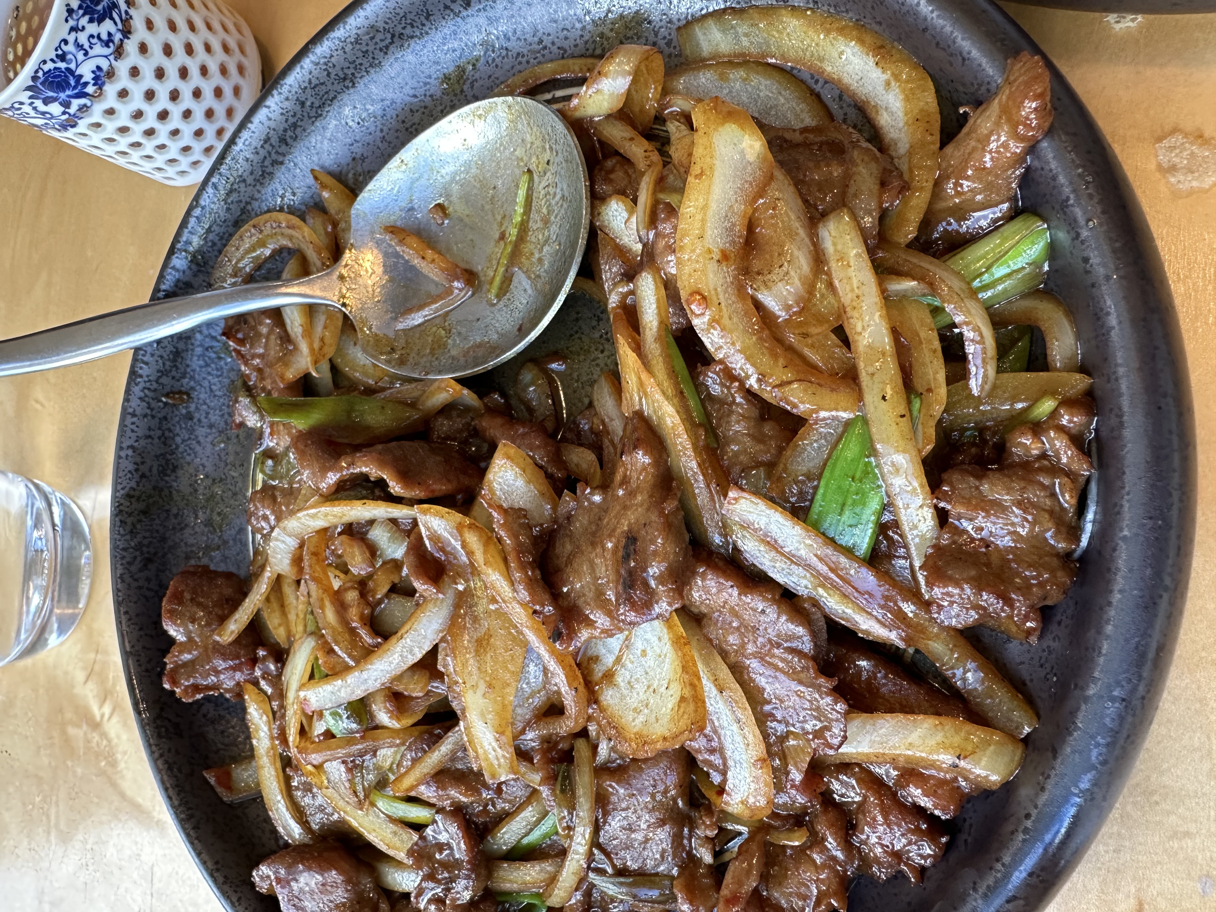 But what is a meal without the ceremony of tea? The oolong tea, served in a pot that seemed to cradle the essence of ancient traditions, was a delicate performance in itself. The teapot itself was a work of art — a handsome copper vessel with an elegantly wrapped brass handle, adorned with a polished carnelian bead on the lid and Chinese characters etched into its side. It sat upon a woven rattan coaster as though it had been placed there by centuries of ritual.