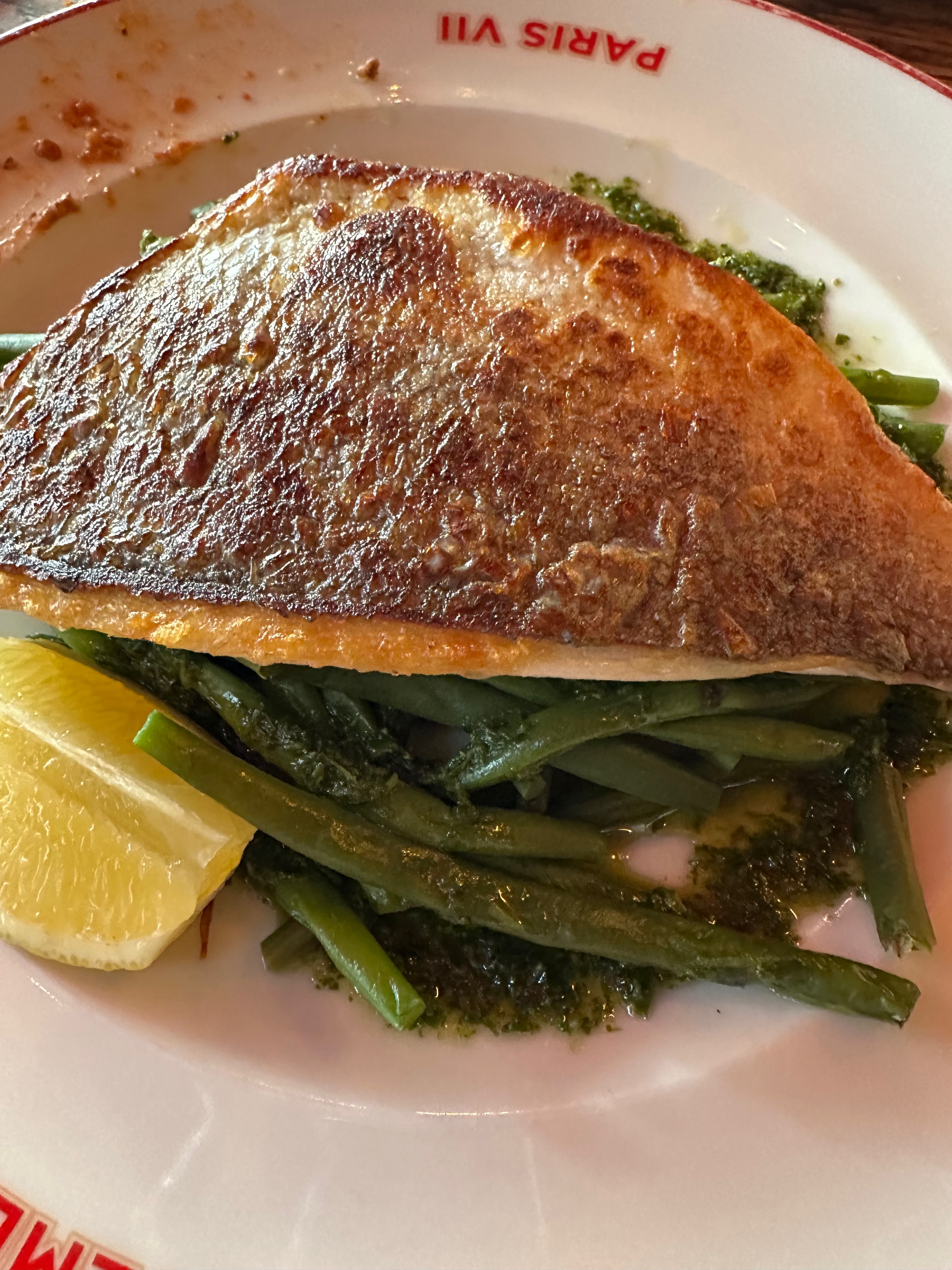 The sea bass arrived skin-side up, golden and crisped with precision. Beneath the skin, the flesh was white, flaky, and moist. A bed of haricots verts supported the fish, cooked just past crisp with a clean, vegetal bite. Alongside, roasted potatoes with a deep caramelized exterior. This was a plate assembled with restraint and served with quiet confidence.